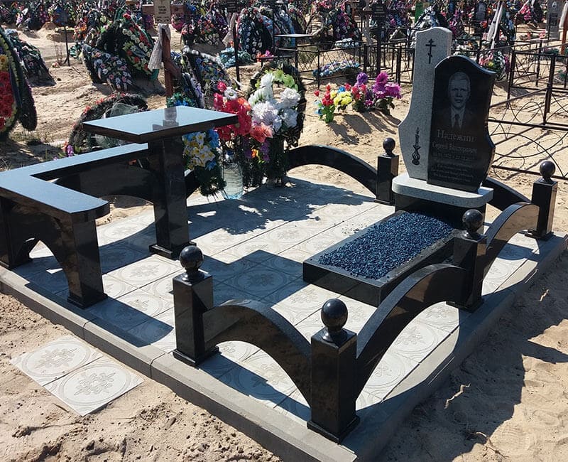 Стандартный комплект памятника включает в себя стелу, подставку и цветник. Плитка приобретается по желанию заказчика и за отдельную плату. Вместо цветника можно установить надгробную плиту.